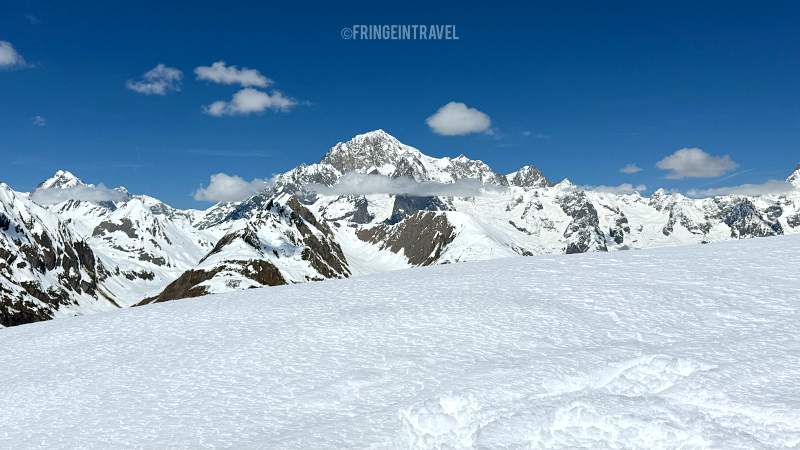 Verso est, guardando giù verso il fondovalle, si distinguono Pré-Saint-Didier e Courmayeur, con la divisione tra Val Veny e Val Ferret ben evidente.