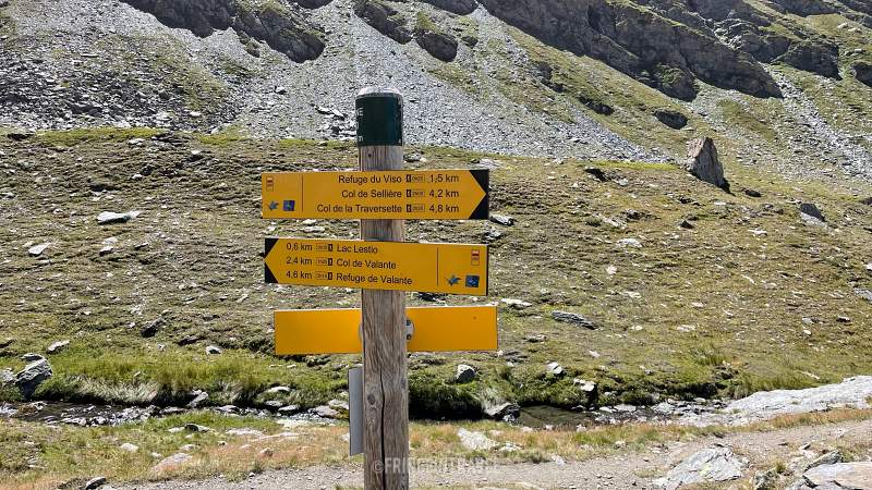 Tappa breve ma intensa. Dal Réfuge du Viso si prosegue a mezza costa in leggera discesa, attraversando il torrente Guil e risalendo fino al Lago Lestiò (2.510 m), un bellissimo specchio d’acqua incastonato in una conca dominata dalla cresta di Punta Roma.
