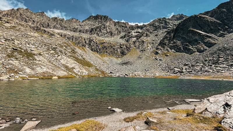 Da Pian del Re inizia la salita vera. Il sentiero sale con tornanti sul versante sinistro della valle, attraversando un ambiente sempre più selvaggio e roccioso. Si supera il bivio per il Lago Superiore e il Rifugio Giacoletti, e si arriva al Pian Armoine (2.500 m). Da qui si prosegue con un traverso sotto le pareti del Monte Meidassa fino all’incrocio con il Sentiero del Postino (2.600 m).