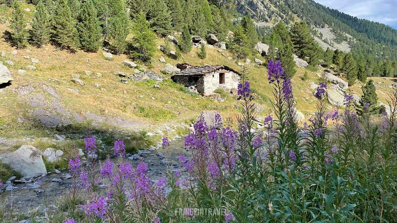 Da qui inizia la salita verso il Passo di San Chiaffredo. Il sentiero attraversa prima un bosco di larici e pini cembri – siamo ai margini del magnifico Bosco de l’Alevé, la più grande cembreta dell’arco alpino –, poi si apre sul bellissimo Pian Meyer (2.126 m), dove il rio divaga formando suggestivi meandri.